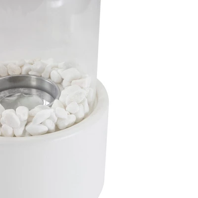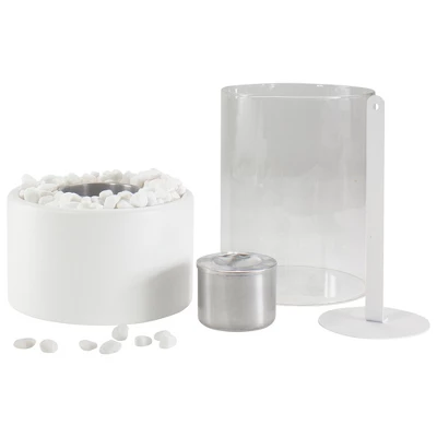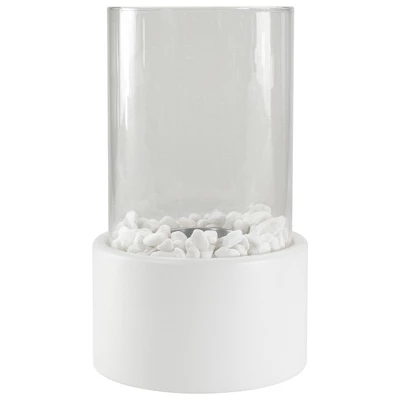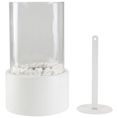 Create a warm relaxing ambiance in your home or outdoor living area with our ventless Bio Ethanol tabletop fireplace. It is fueled by smokeless, odorless, cleaning-burning Bio Ethanol fuel, which means it is safe to use indoors as well as outdoors. Without the need for electricity, a chimney, or framing, you have the ability to move the fireplace from room to room or relocate it to your backyard living space for the summer months. With its sleek modern design and glass panels that allow full flame visibility, this is sure to become a conversation piece. Bio Flame fireplaces are completely self-contained which makes them very quick and easy to install. Product features:Real flame tabletop fireplaceFueled by odorless, smokeless Bio Ethanol fuel (not included)Produces 1,167 BTUs and can comfortably warm a room up to 215 square feetPowder coated steel constructionClear tempered glass provides 360 degree full flame viewEasy to light and extinguish with the included snufferStainless steel double cup burnerIncludes a wool wick that ensures a longer lasting flameWhite stone for added dimension to fireplaceFuel capacity: 150ml Burning time: 60 minutesFor indoor or outdoor useQuick and easy setupDimensions: 10.5″ high x 6.25″ diameter