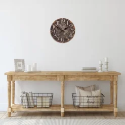 Imagine which part of the world you would like to visit this wall clock. Perfect for small spaces, it will be a great accent to your walls. You don’t have to worry about electric cords since it is battery-operated.Product Features:Brown, black and white round wall clockFeatures large easy-to-read black numbersBlack hour and minute handsMetal hook on back for hangingGlobe continent design in the backgroundRequires (1) AA battery, not includedRecommended for indoor or outdoor useDimensions:12″H x 12″W x 1.5″DMaterial(s):MDF/plastic/metal