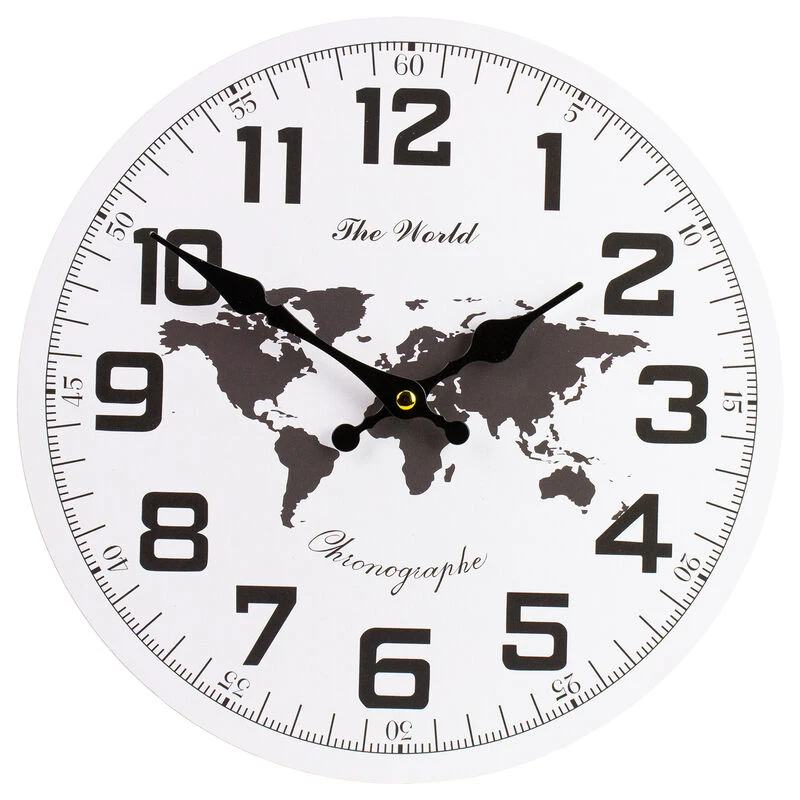 12″ White and Black Battery Operated Round Wall Clock with Continent Design