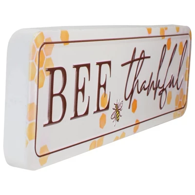 Welcome spring and summer with this inspirational “Bee Thankful” metal plaque. Featuring honeycomb shapes, this would be perfect to display in kitchens and entryways. It also makes a perfect gift for your family and friends.Features:Rectangular metal “Bee Thankful” wall plaque decorFeatures a flying bee and golden yellow honeycombsWhite background with brown writingReady to hang with key hole hooks on the back No assembly requiredRecommended for indoor useDimensions: 5.75″H x 20″W x 1″DMaterial(s): metal