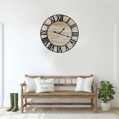 This unique clock is designed with black metal roman numeral numbers. A great wall piece for an industrial decor design. You don’t have to worry about electric cords since it is battery-operated.Product Features:Black metal round wall clockFeatures roman numerals in black metalDesigned with a whitewashed, wood-like backingBlack hour and minute handsRequires (1) AA battery, not includedRecommended for indoor or outdoor useDimensions:24″H x 24″W x 1.5″DMaterial(s):MDF/plastic/metal