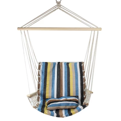 This hanging chair would be a vibrant addition to your outdoor living space. Stay comfy in your outdoor space in this padded hammock chair that features armrests, a pillow, and a striped multi-color design, perfect for any outdoor space. This fun hammock is easily transported and hung where ever you venture!Product Features:Blue, brown, black, yellow and white striped patternHammock includes a padded seat, a pillow attached, and wooden armrestsHangs on a wooden bar with an attached rope going through metal holes for easy hangingRecommended for adults, children need to be supervisedRecommended for both indoors or outdoorOne person sitting hammockWeight capacity: 265 lbsDimensions: 35.25″ wide x 37″ longTop of ring to arm rest: 42.5″Back width: 23.5″Back height: 20″Height of the wooden bar to bottom cushion: 38″Material(s): cotton/plastic/woodNote: hammock only – stand and hanging hardware are not included
