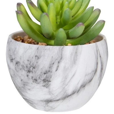 Succulents have become a growing trend as they are easy to care for and require little attention. This artificial succulentis even better as it looks real but requires no maintence. The green succulent is nestled inside of white pot with a marble like finish. Grab yourself one or two of these succulents today to add some character to your home or office.Features:Artificial green succulent in a potNestled inside of a faux marbled plastic potPlant is set in “faux dirt” and stone for stabilityRecommended for use indoors only – if using outdoor keep in a covered areaOverall dimensions: 4.25″ high x 3.25″ diameterPot dimensions: 2.5″ high x 3.25″ diameterMaterial(s): plastic