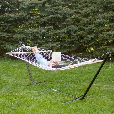 Relax in style with our portable tree hammock. A comfy addition to your outdoor space. This hammock is brown with a lattice pattern and wooden bars to attach the hammock to a stand. Perfect for hanging between trees, on your balcony or even given as a gift for that special someone this summer season!Features:Brown rope hammock with lattice pattern rope designComes with attached rope and wooden bars for easy hanging and stability1-person hammockRecommended for adults, children need to be supervisedCan be used indoor or outdoorWeight capacity: 265lbsDimensions: 78″ long x 55″ wideMaterial(s): polyester/woodNote: hammock only – stand and hanging hardware are not included