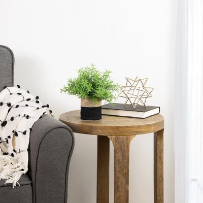 Brighten up your home or office space with this mini artificial spring foliage plant! Featuring a fabric bag base with a stylish color block design of beige and black, this faux plant can be displayed in any room. The lush green leaves are intricately designed to mimic the look and feel of real foliage, bringing the freshness of spring indoors all year round. Perfect for those who love the beauty of nature but don’t have the time or space to care for live plants, this artificial foliage plant is a low-maintenance and long-lasting option. Add it to your decor today to create a fresh and inviting atmosphere.Features:Artificial spring foliage plantNestled inside of a beige and black fabric baseGreen foliage is attached to foam base inside potIndoor use only Dimensions: 8″ high x 9″ diameter (approximately)Pot dimension: 3.5″ high x 3″ diameterMaterial(s): plastic/burlap/foam