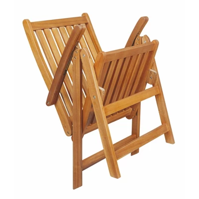 Summer time is about enjoying the sunshine with family and friends. This set of chairs will be the perfect addition to your summertime decor and to use year round. Chairs fold up which makes them easily transportable and easy to store. Product Features: Wooden folding outdoor patio chairsThe chairs are comfortable with curved seats and backs Features long-lasting wood with a water-based and waterproof coating finishChair backs have 5 tilt positions for added comfort Sit up for dining, then recline for relaxing Fold down for easy storage Assembly requiredWeatherproof for indoor or outdoor use Brass colored hardware and joints Dimensions of each chair: Overall: 42″ high x 23.75″ wide Backs: 25.75″ high x 20″ wide Seats: 20″ wide x 18.5″ deep Material(s): acacia wood/metal