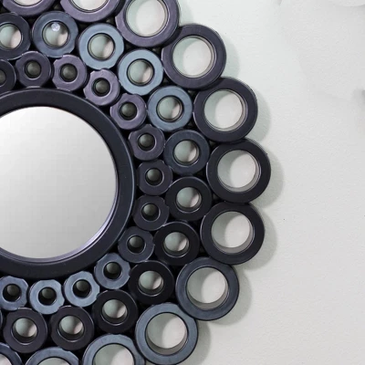 A beautifully crafted mirror is great for opening up the space of any room. These black orb inspired mirrors is the perfect addition to your home decor. Easily matched with several decor themes, these mirrors include hanging hardware for effortless installment. Features:Set of 3 framed mirrorsThe orbs are black in colorMirrors are roundInner frame creates a centered circleOrb design created with hollow tiered circles cascading towards the center Includes hanging hardware Recommended for indoor use only Overall Dimensions: 9.5″L x 0.5″W x 9.5″H Center Mirror Dimensions: 3″ diameterMaterial(s): plastic/glass